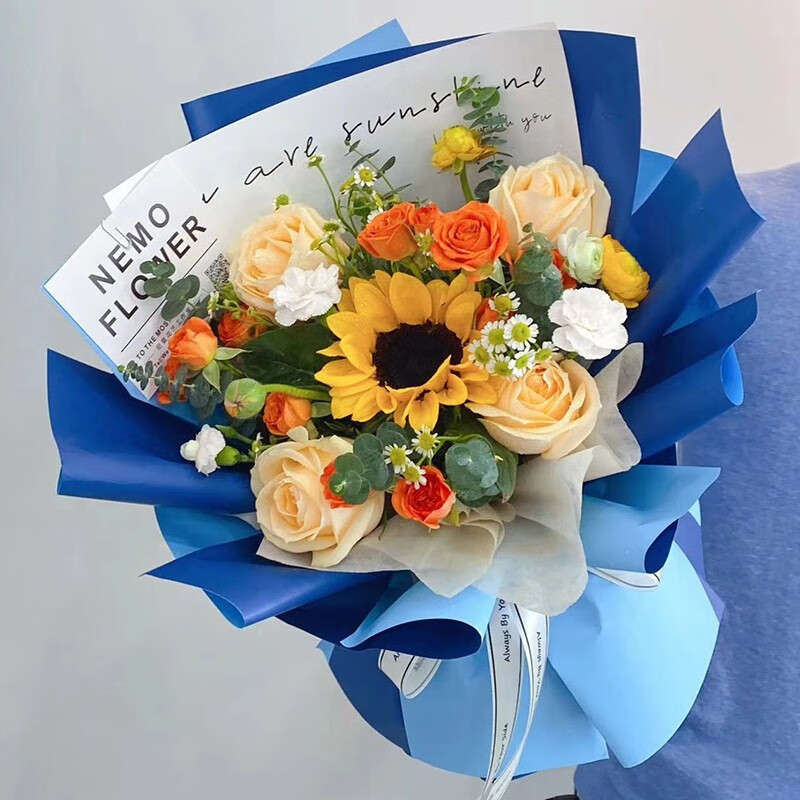 【蓝色港湾】1朵向日葵,4支香槟玫瑰,2支洋桔梗,4支橙色多头泡泡,搭配尤加利叶、小雏菊等装饰。