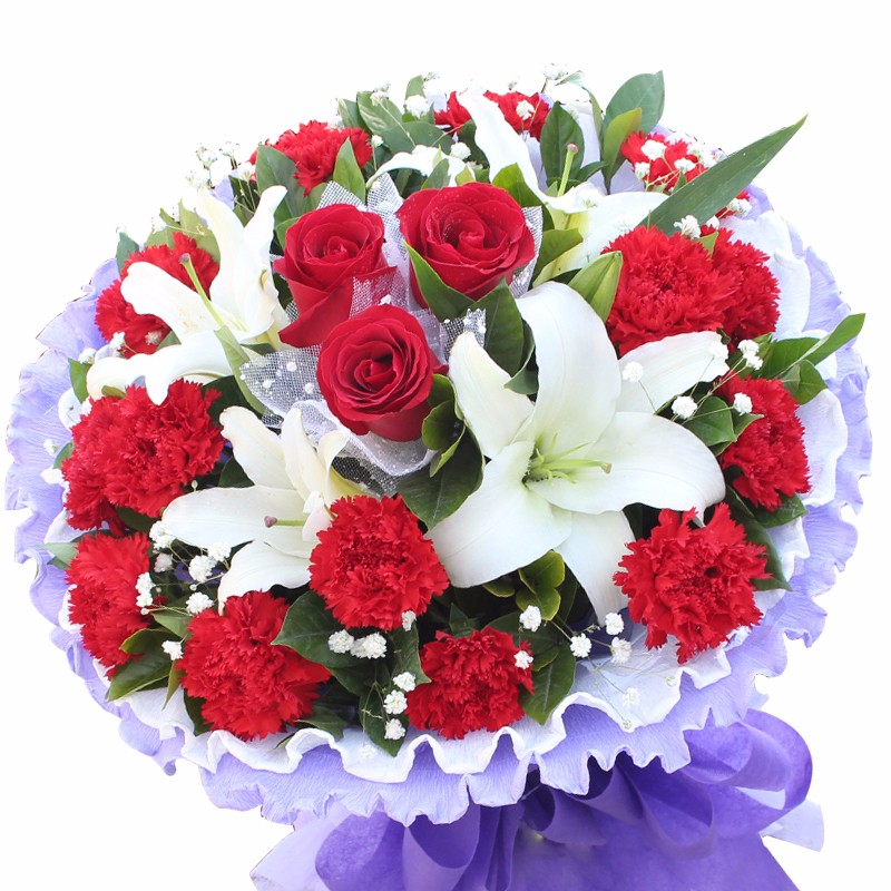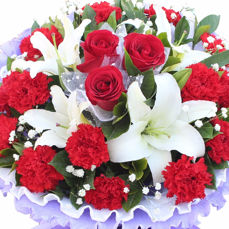 花材: 16支红色康乃馨,3朵红玫瑰,2支白色多头百合,搭配适量满天星、绿叶。