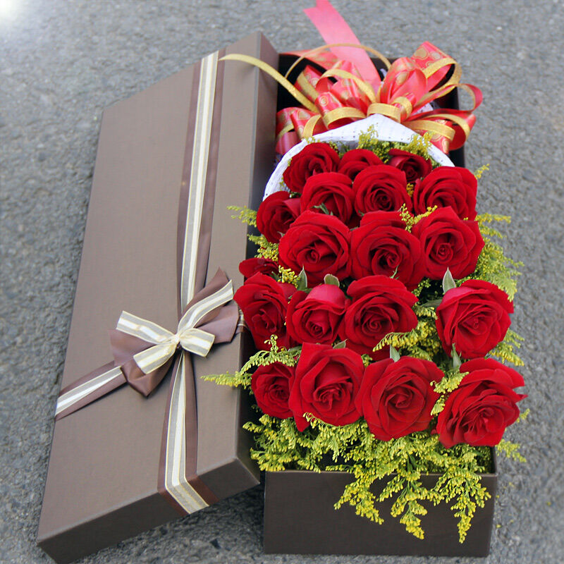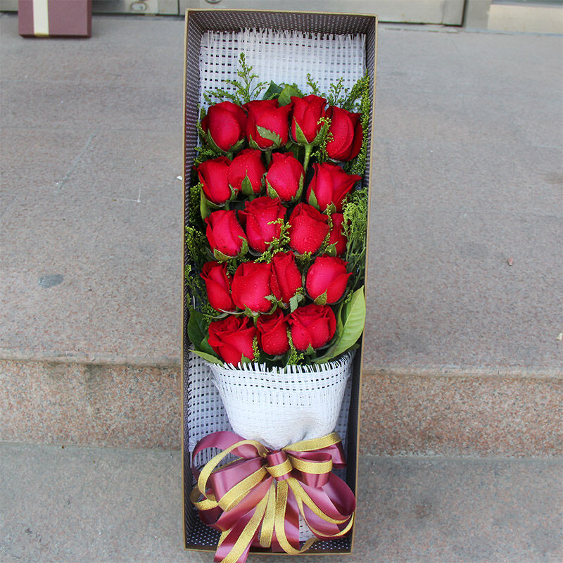 花 材:精选19支精品红玫瑰,黄莺间插,丰满装饰。