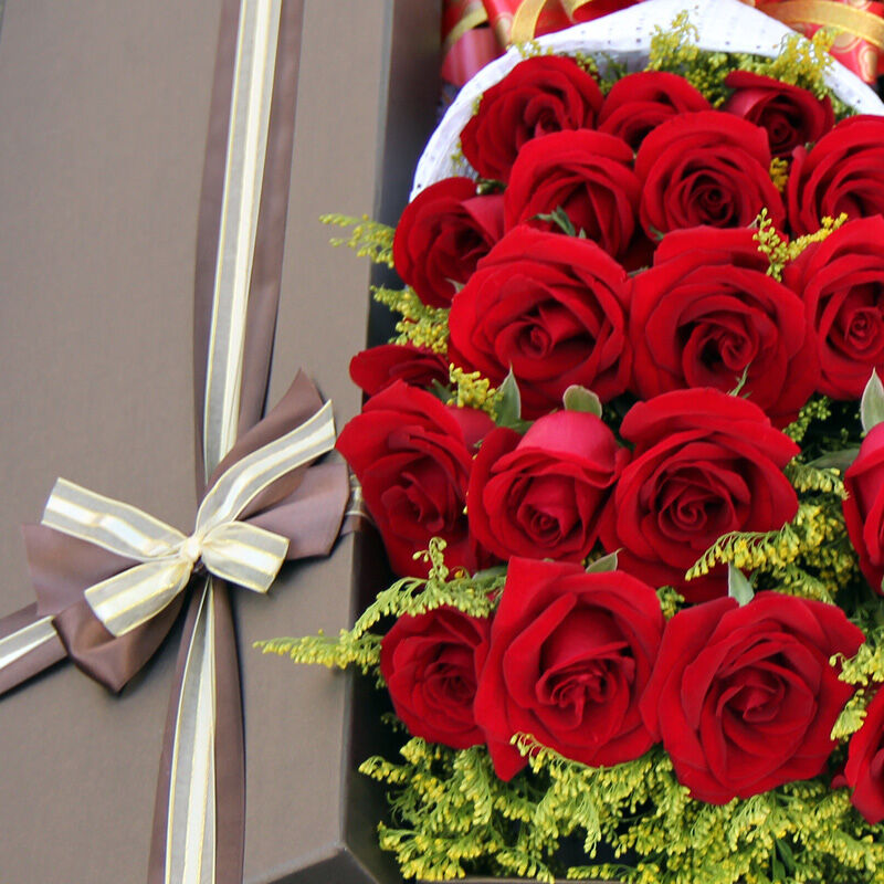 花材: 精选19支精品红玫瑰,黄莺间插,丰满装饰。