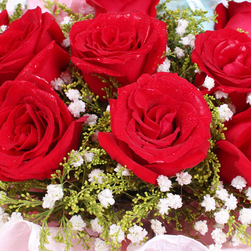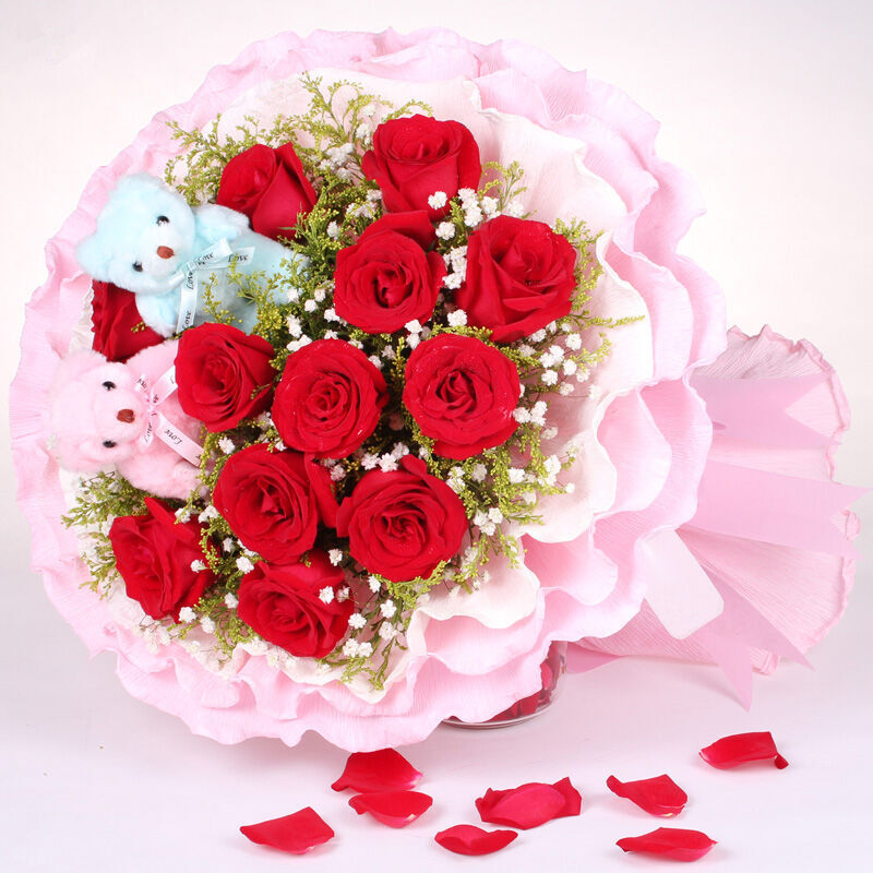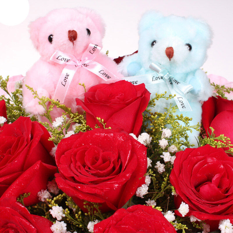 花 材:精选11支极品红玫瑰,一对可爱小熊,搭配满天星、黄莺点缀。