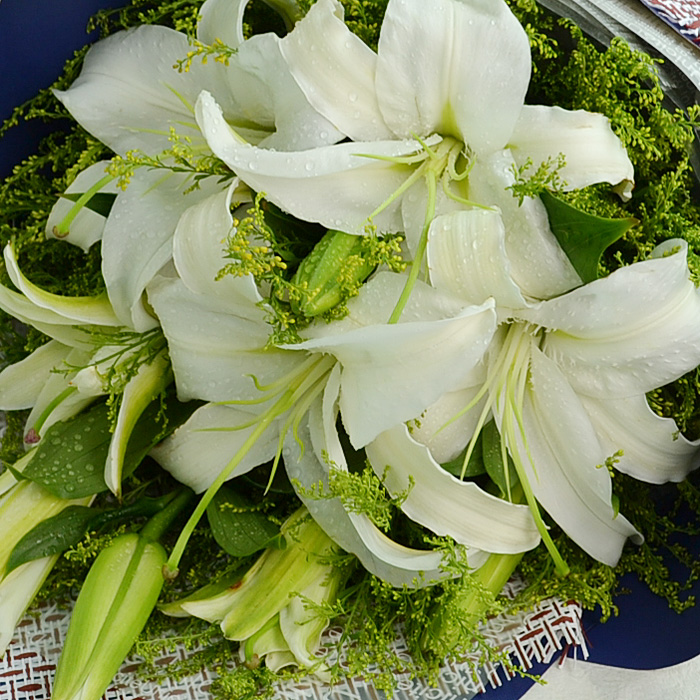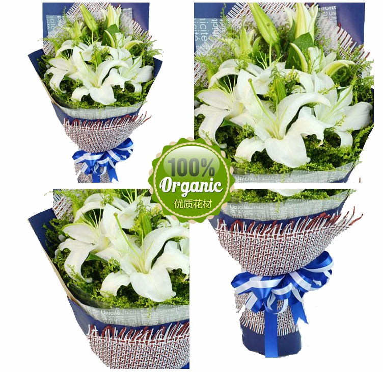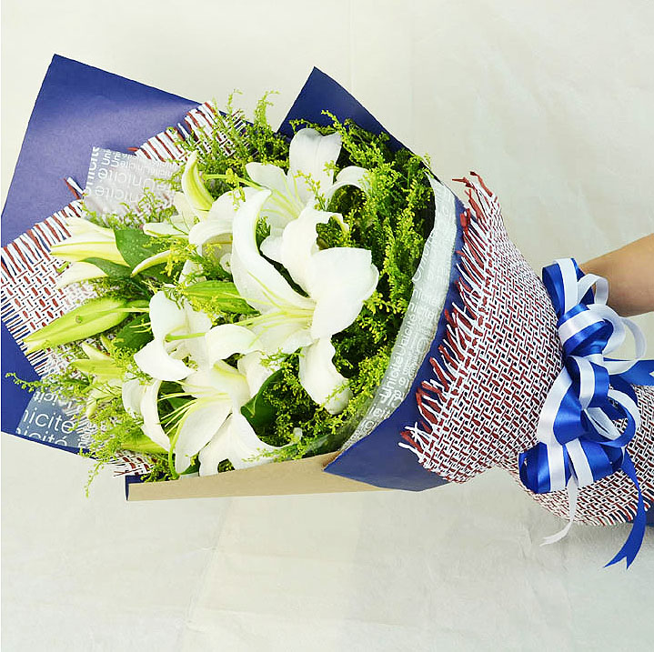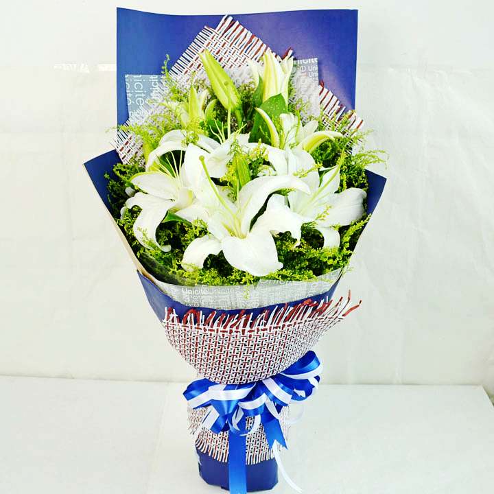 花 材:11朵香水百合,绿叶间插。