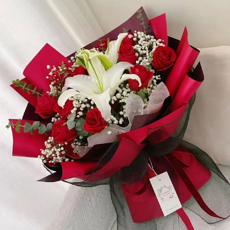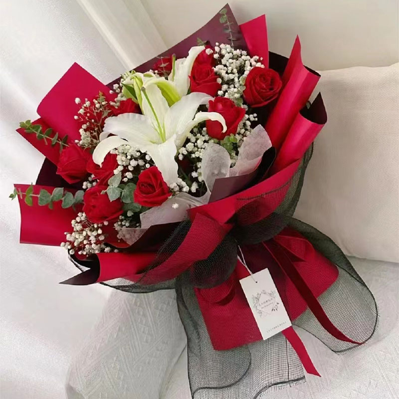 花 材:11朵红玫瑰,1支白色多头香水百合,搭配满天星、尤加利叶装饰。