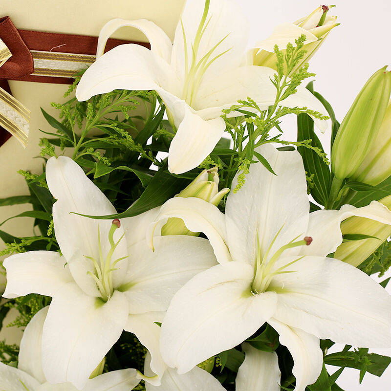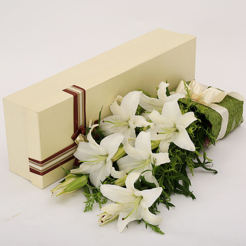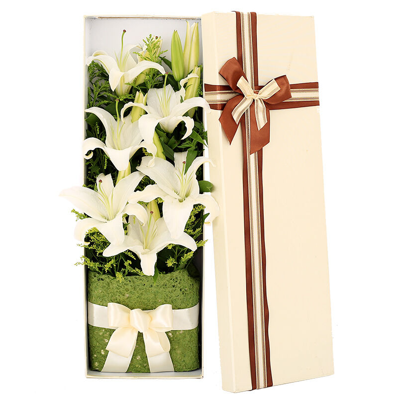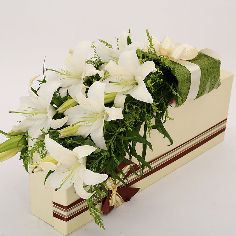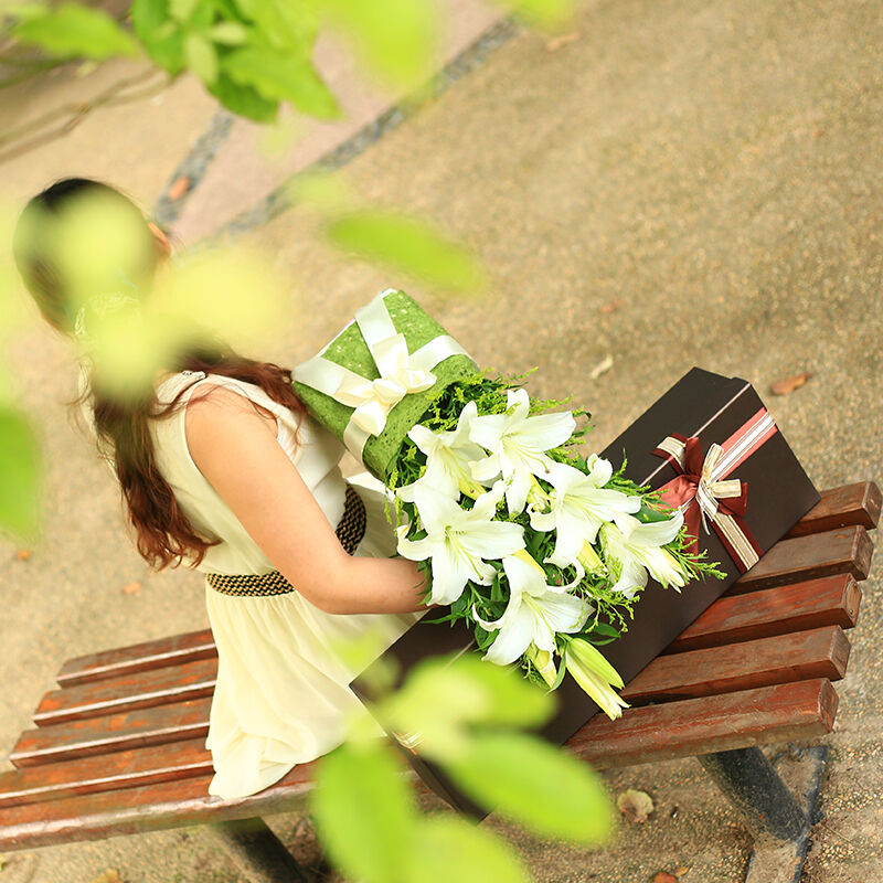 花材: 12朵香水百合礼盒+黄莺,绿叶丰满点缀