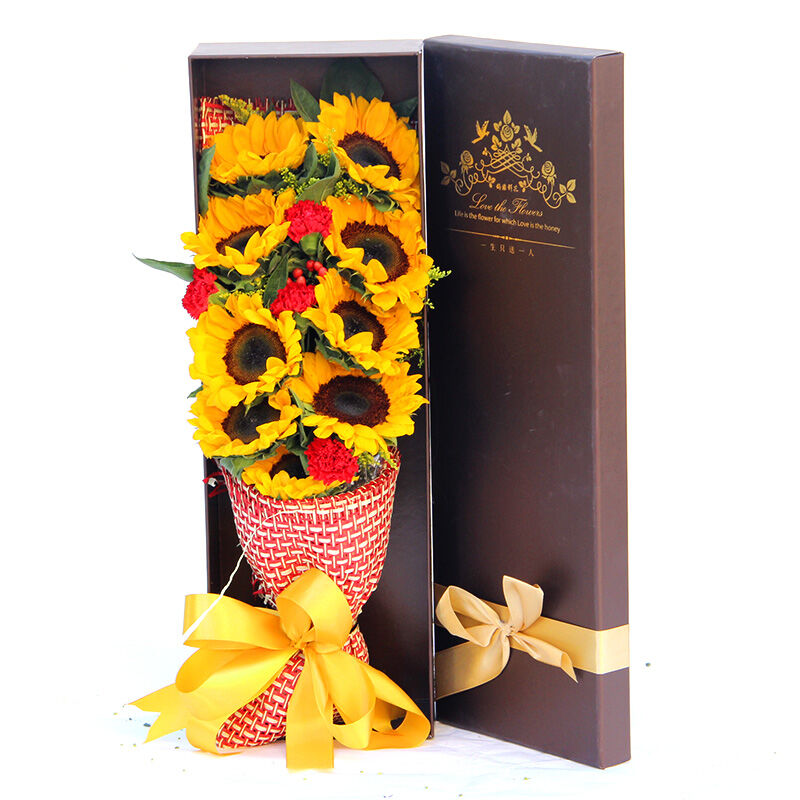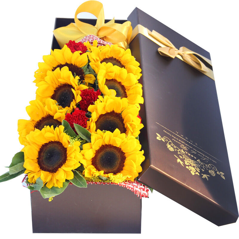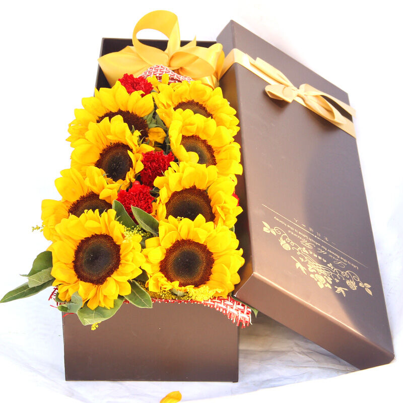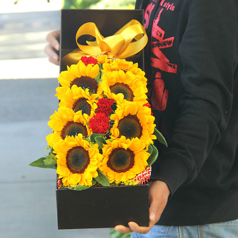花材: 9支向日葵礼盒,3支红色康乃馨,黄莺、红豆点缀。