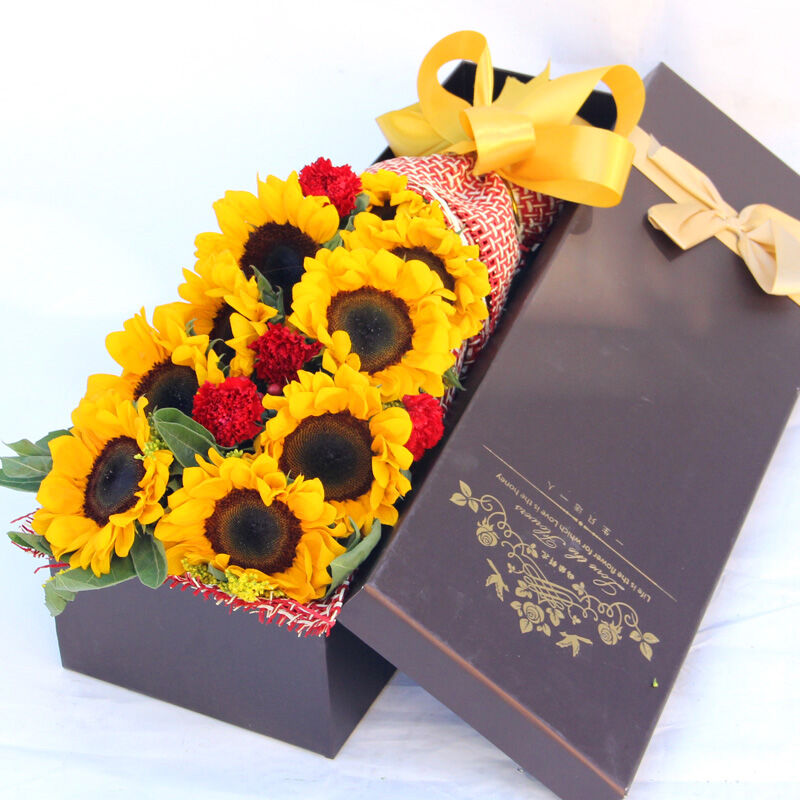 花 材:9支向日葵礼盒,3支红色康乃馨,黄莺、红豆点缀。