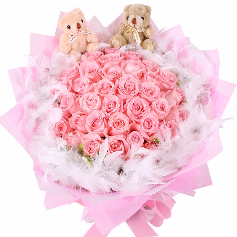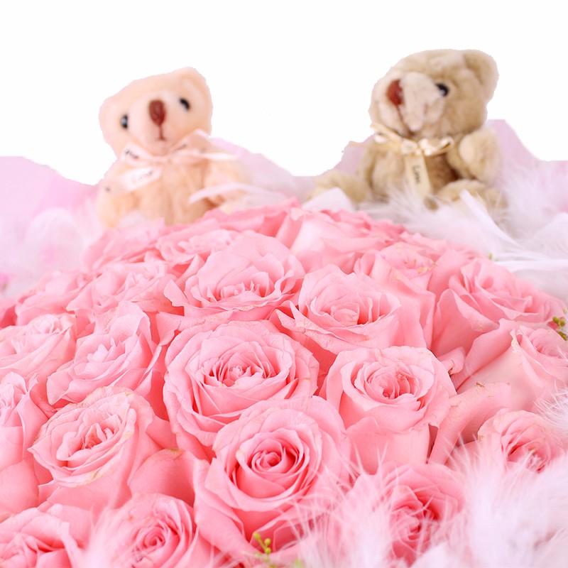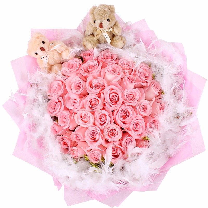 花 材:33支精品粉玫瑰+2只可爱小熊,搭配适量白色鹅毛、黄莺草