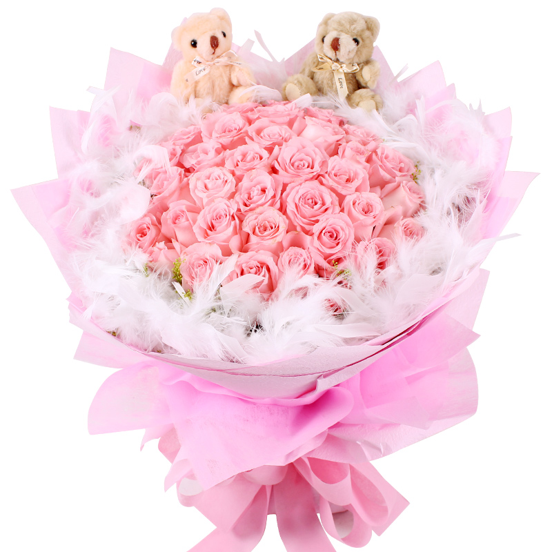 花材: 33支精品粉玫瑰+2只可爱小熊,搭配适量白色鹅毛、黄莺草