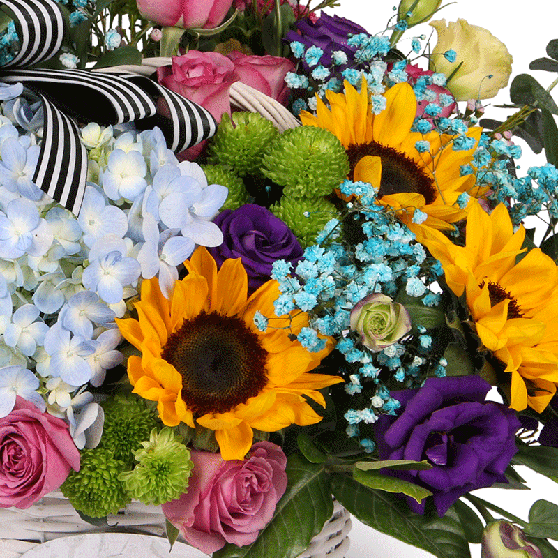花 材:9支精品紫玫瑰、1支蓝色绣球、3支向日葵、3支紫色洋桔梗、1支黄色洋桔梗,搭配适量蓝色满天星、绿色小雏菊、粉色相思梅、尤加利、栀子叶。