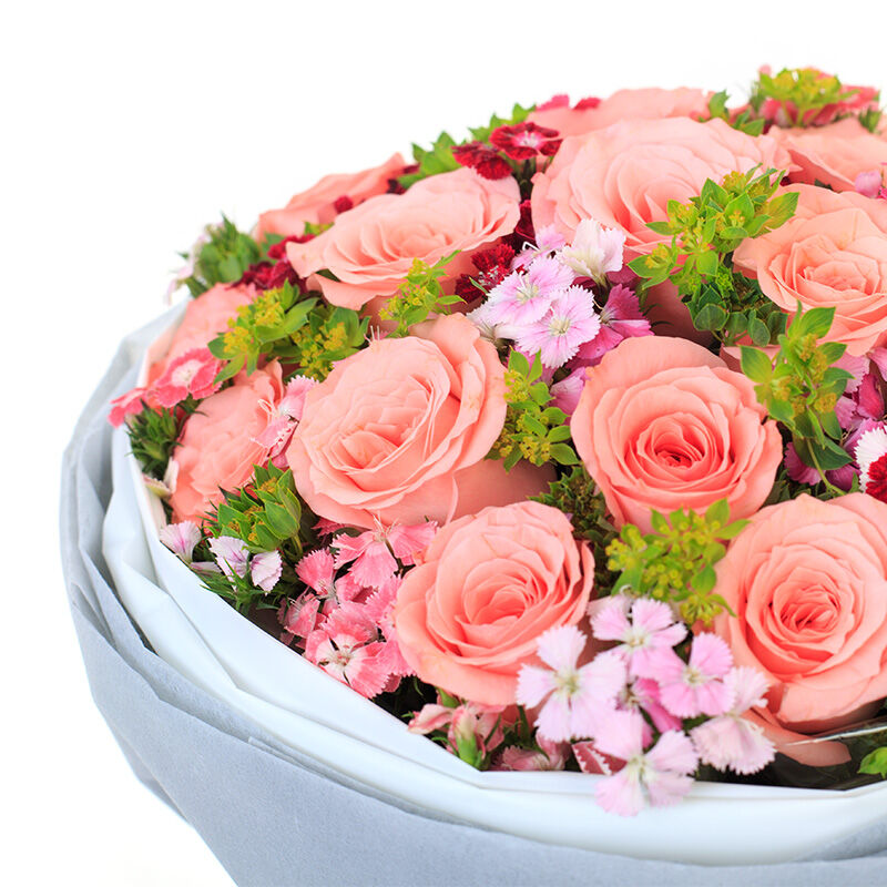 花材: 19朵粉玫瑰,搭配叶上金、相思梅点缀。