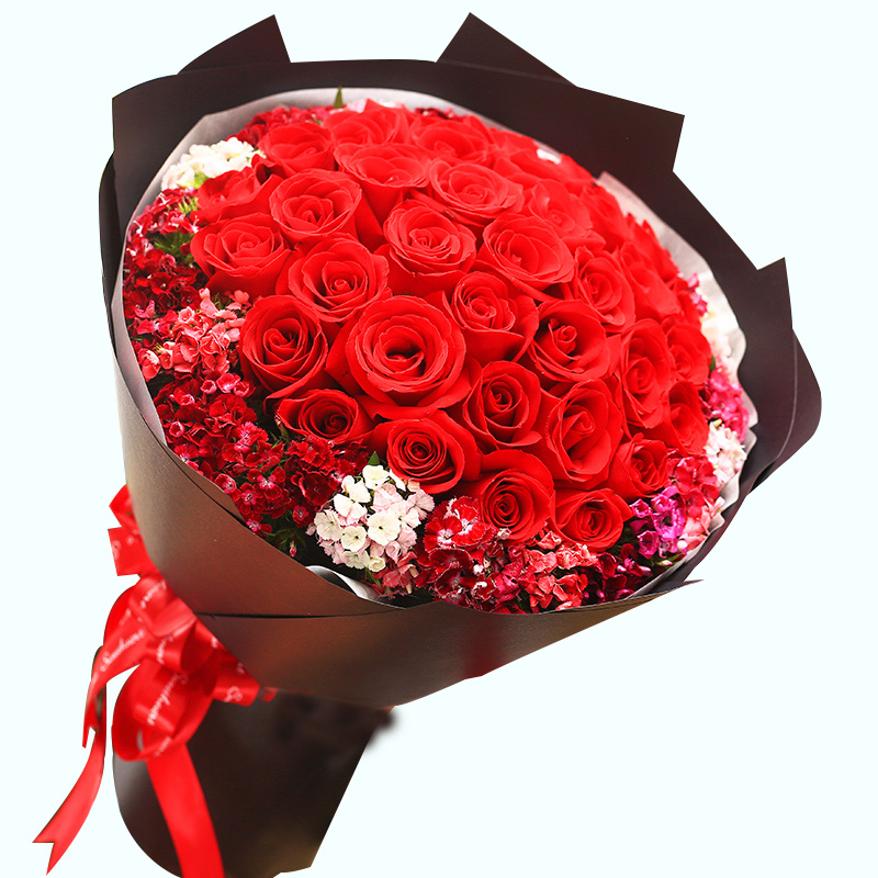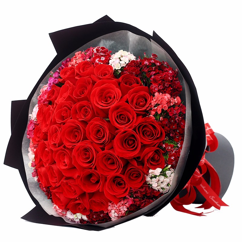 花材: 33支精品红玫瑰,外围搭配适量红色、粉色、白色石竹梅。