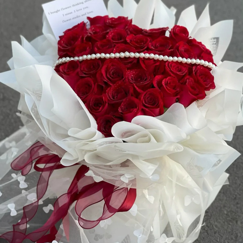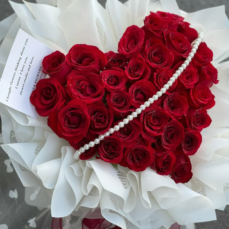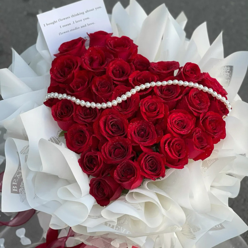 花 材:33朵红玫瑰,心形造型,1条珠串装饰花面。