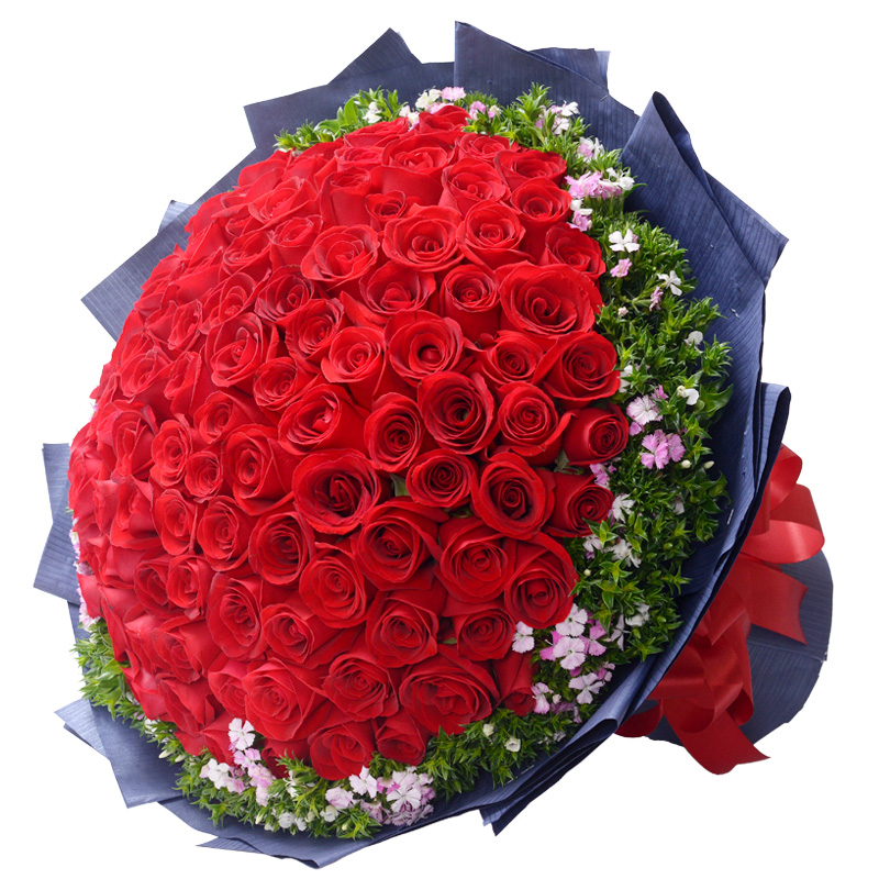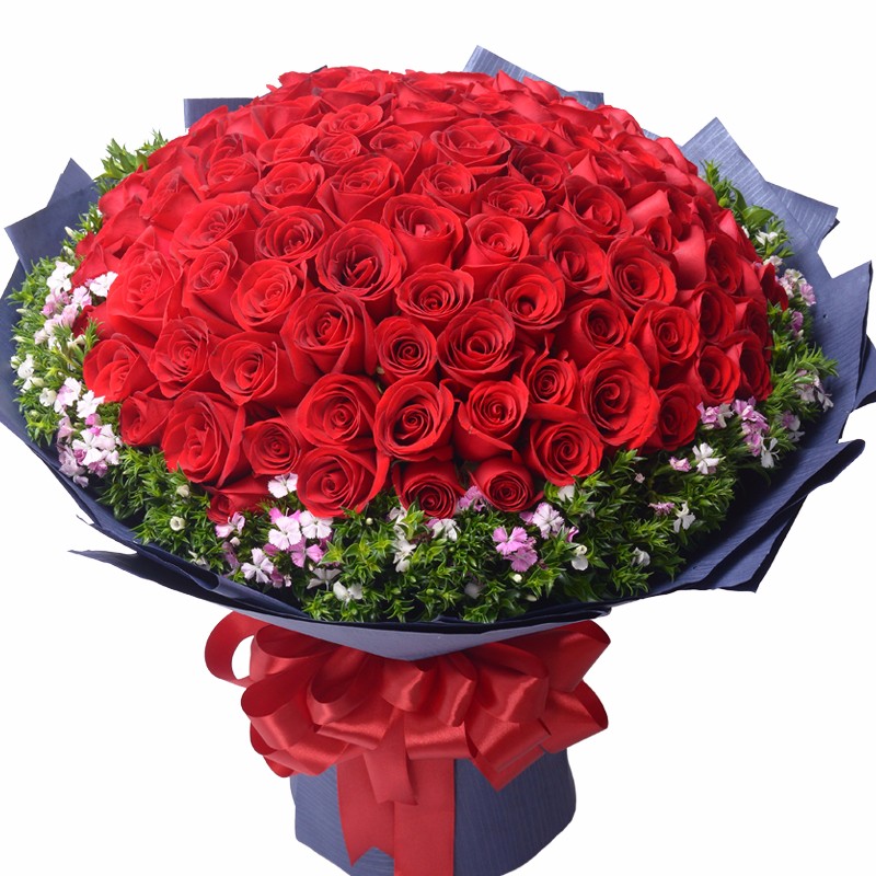 花材: 99支精品红玫瑰,搭配适量相思梅。