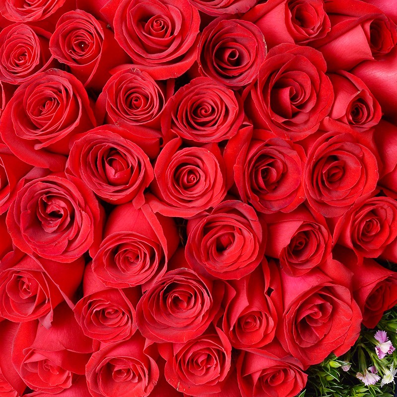 花 材:99支精品红玫瑰,搭配适量相思梅。