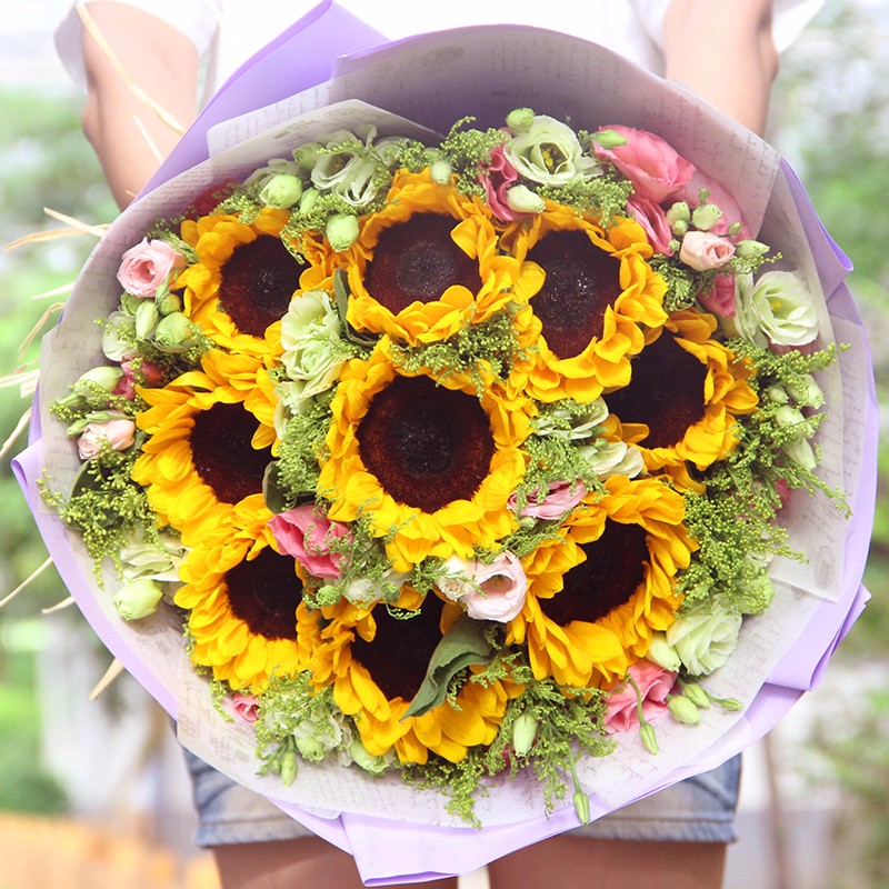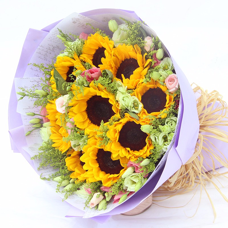 花 材:9支精品向日葵,搭配适量绿桔梗、粉桔梗、黄莺。