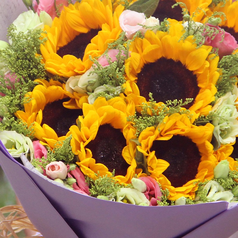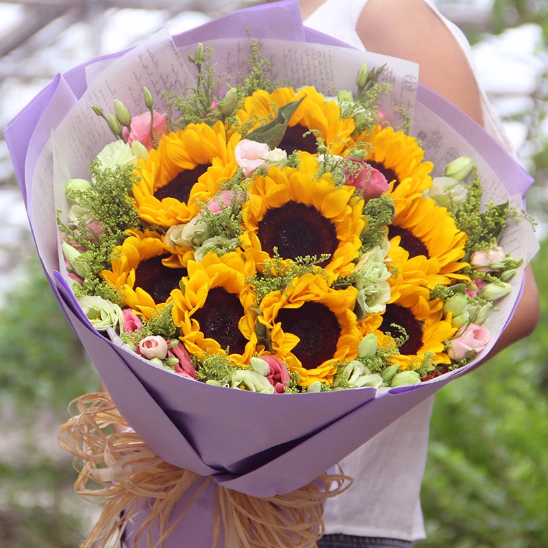 花材: 9支精品向日葵,搭配适量绿桔梗、粉桔梗、黄莺。
