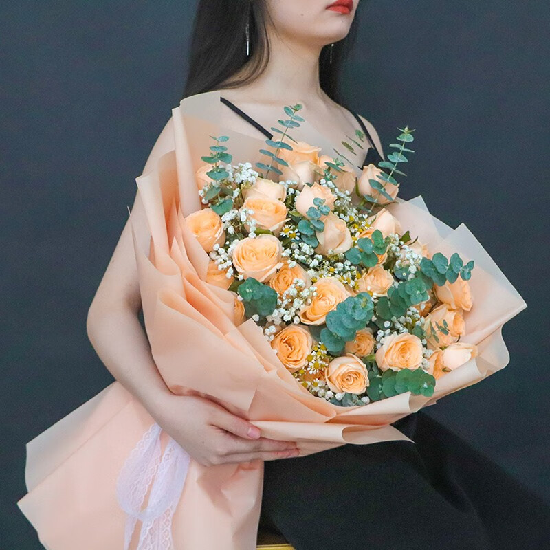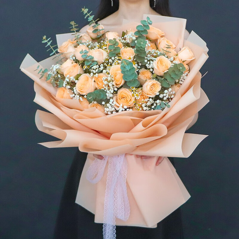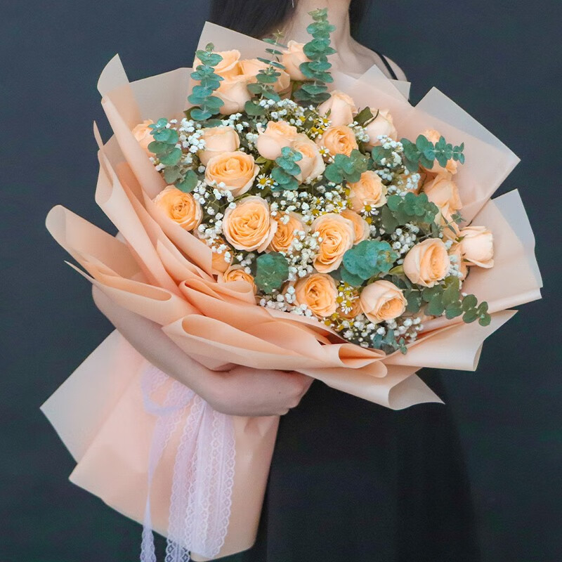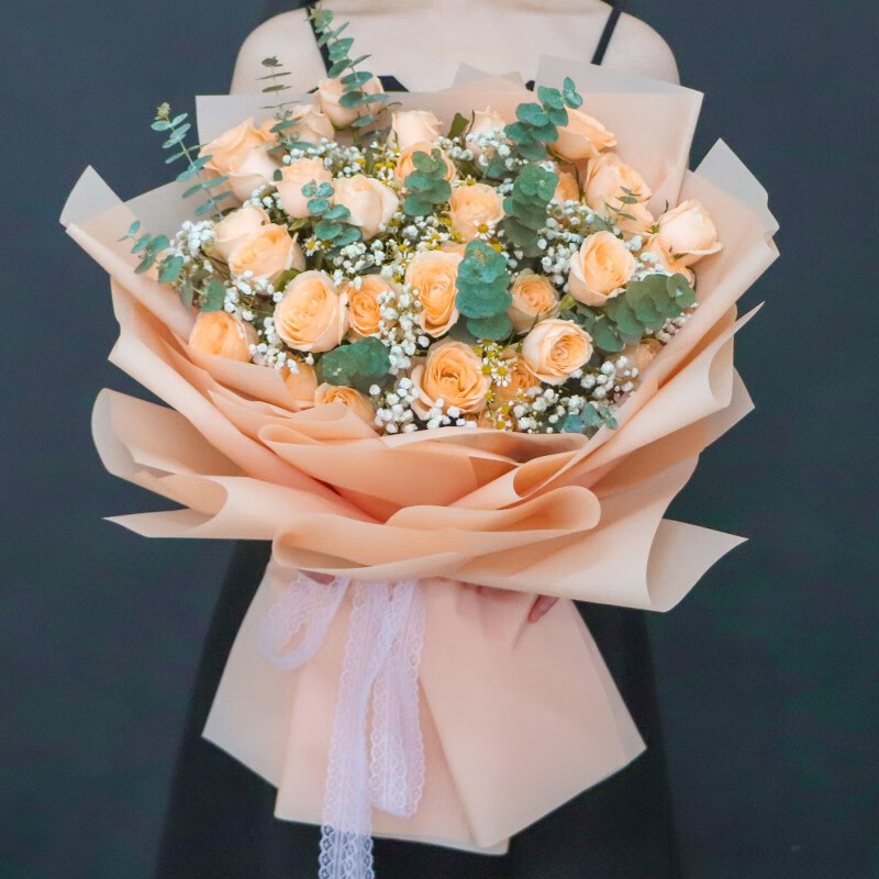 花 材:33支精品香槟玫瑰,搭配满天星、尤加利叶、洋甘菊装饰。