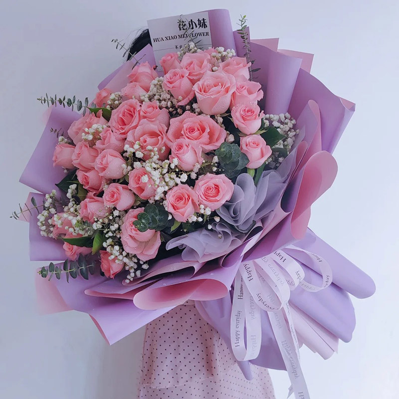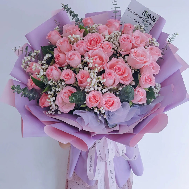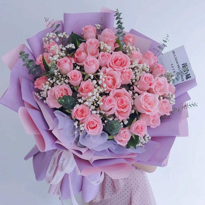 花 材:33朵粉玫瑰,搭配满天星、尤加利叶间插配饰。