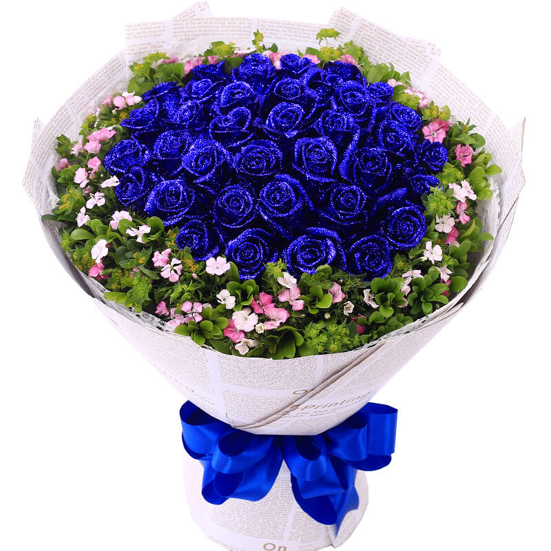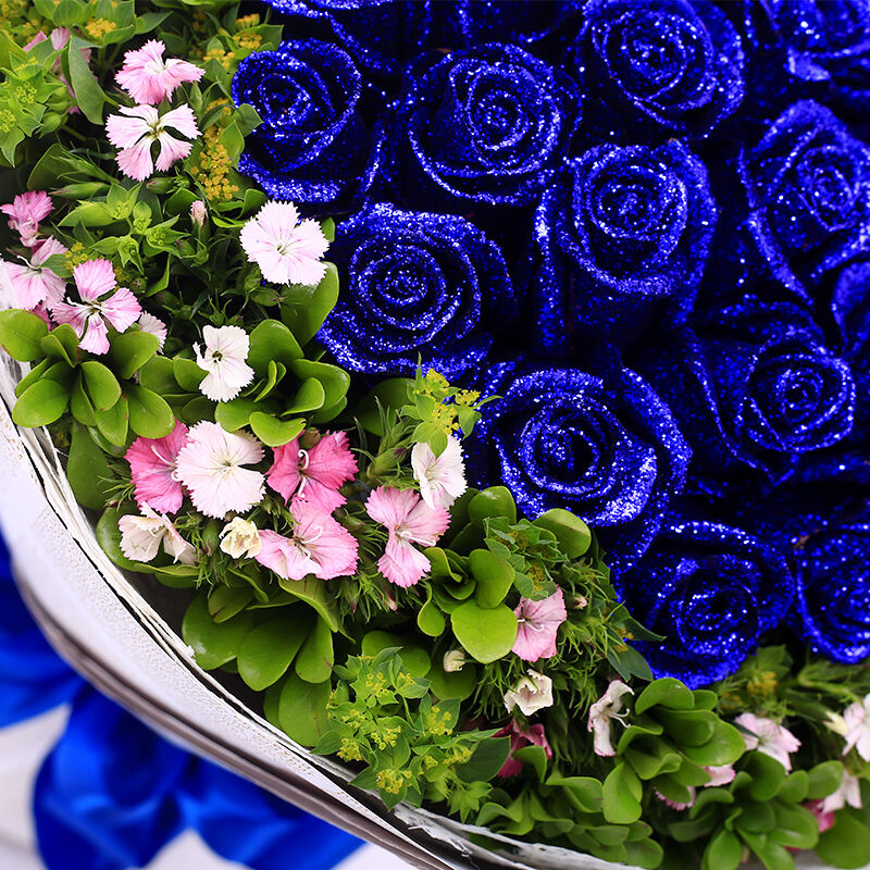 花材: 33支精品蓝色妖姬,搭配适量栀子叶、相思梅、叶上黄金。