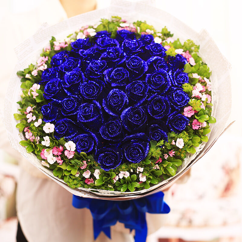 花 材:33支精品蓝色妖姬,搭配适量栀子叶、相思梅、叶上黄金。