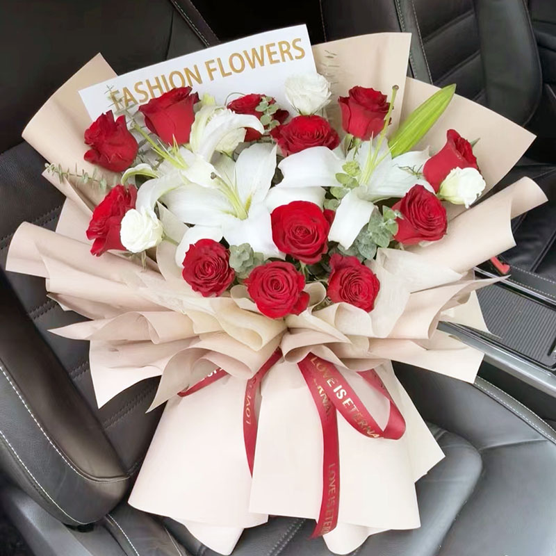 花材: 11朵精品红玫瑰,2支多头白色香水百合,搭配桔梗、尤加利叶间插。