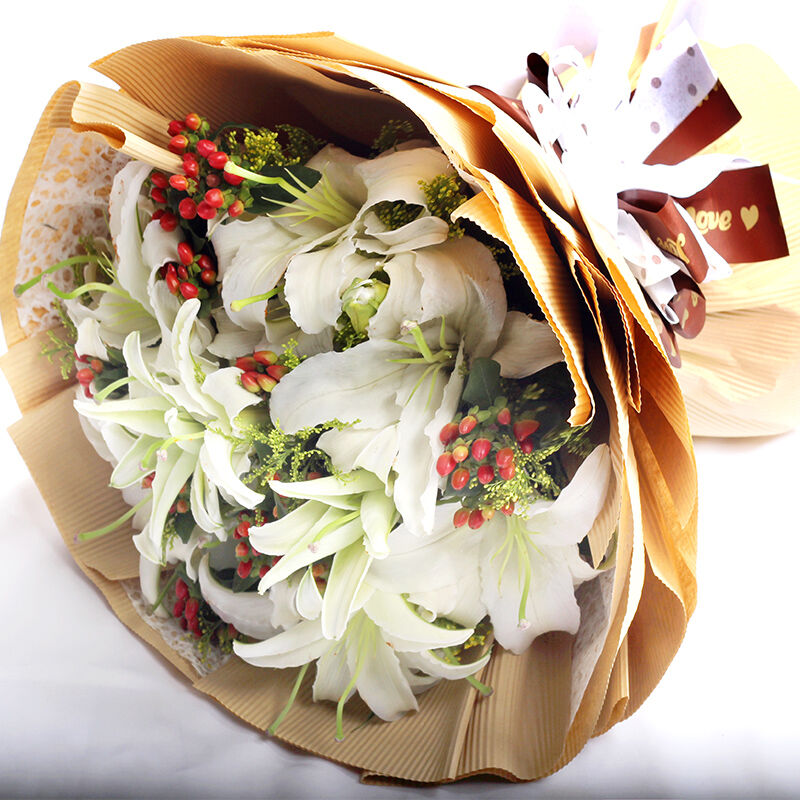 花材: 精选11朵香水百合,搭配相思豆、黄莺点缀。