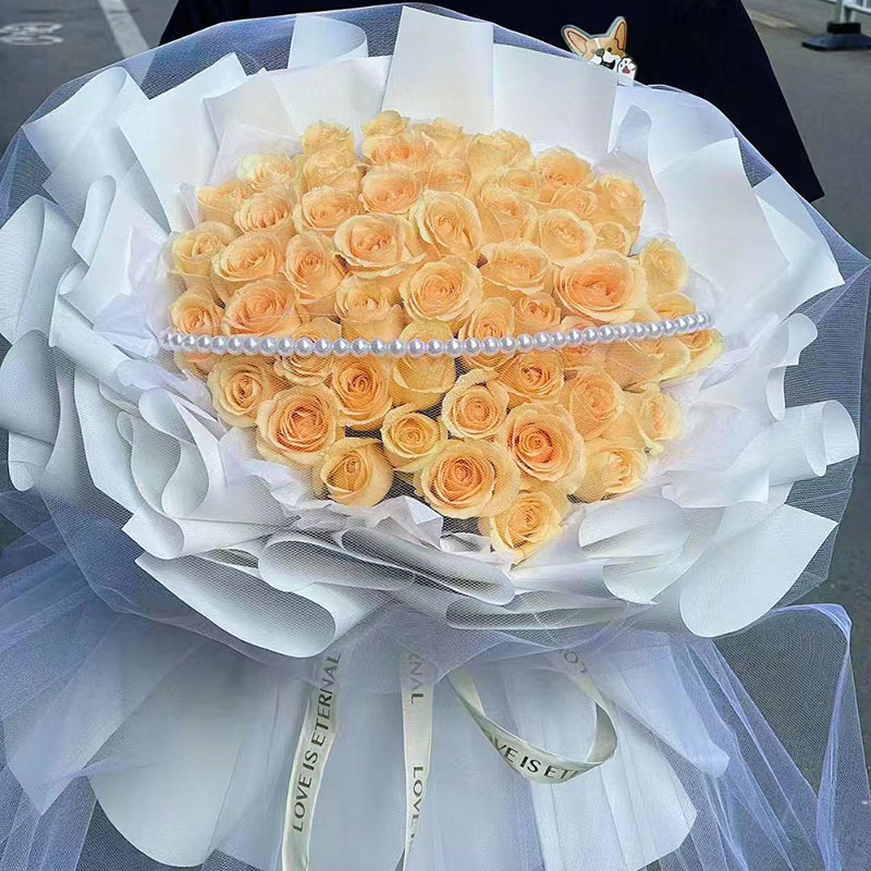 花材: 精选52支香槟玫瑰,搭配珠串花面装饰。
