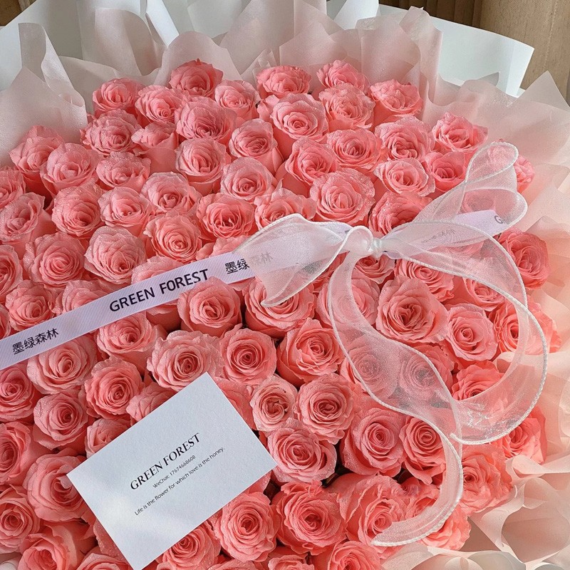 花 材:精选99朵粉玫瑰,1条缎带系蝴蝶结装饰花面。