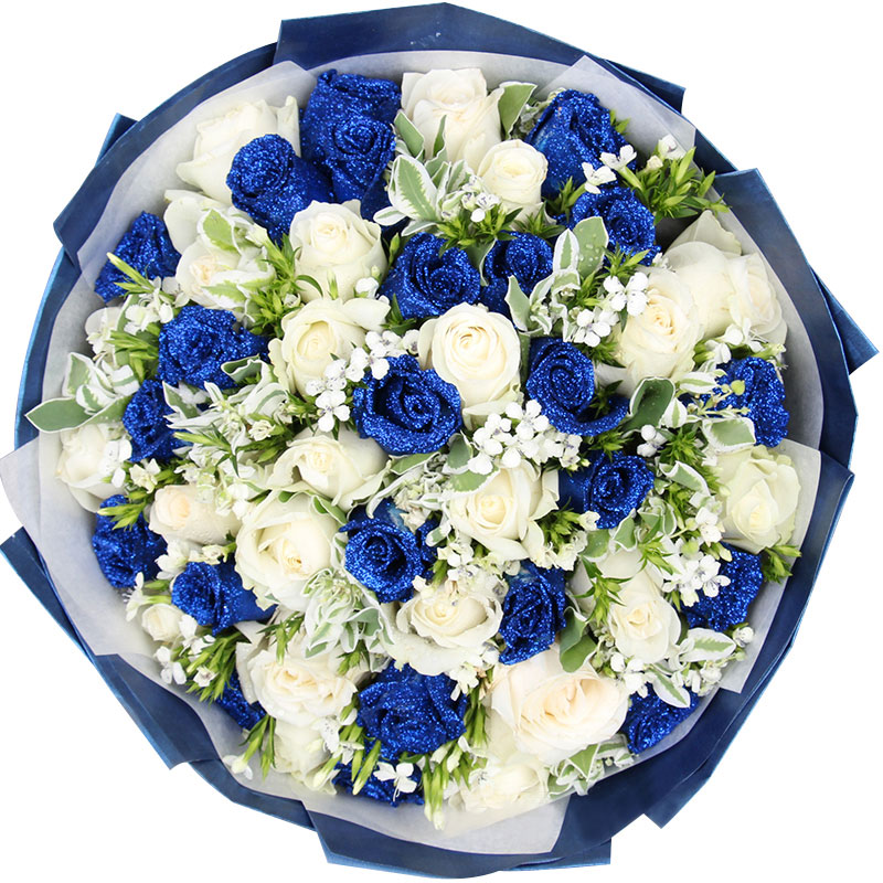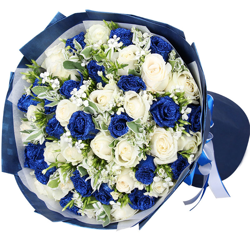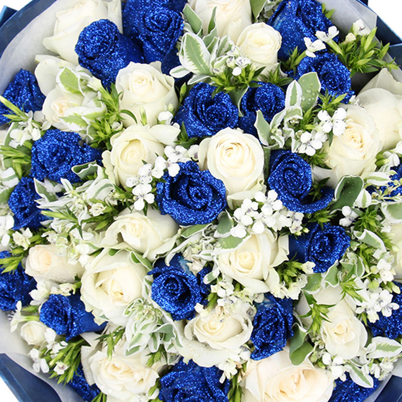 花材: 18朵蓝色妖姬,15朵白玫瑰,搭配相思梅,叶上花点缀。