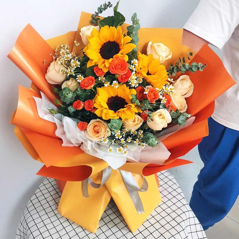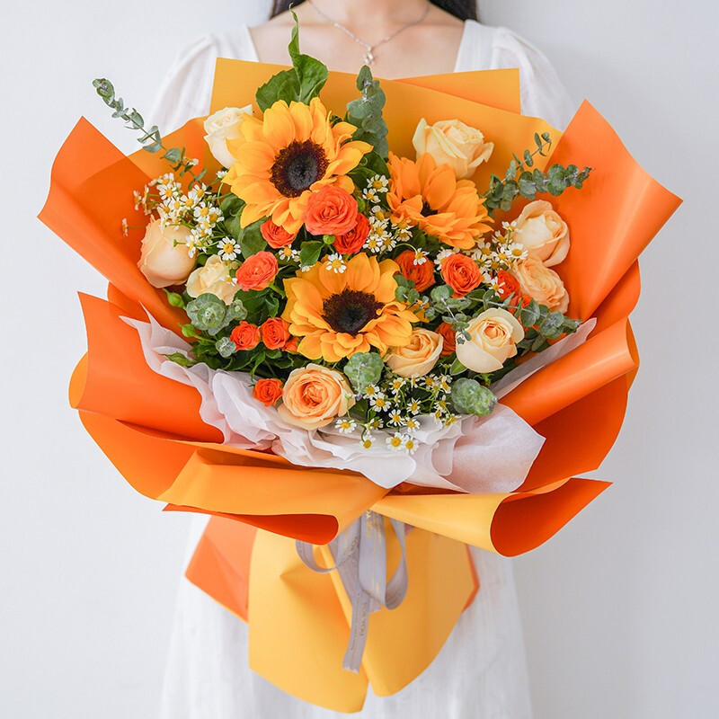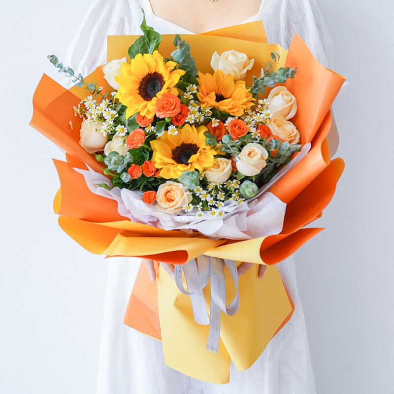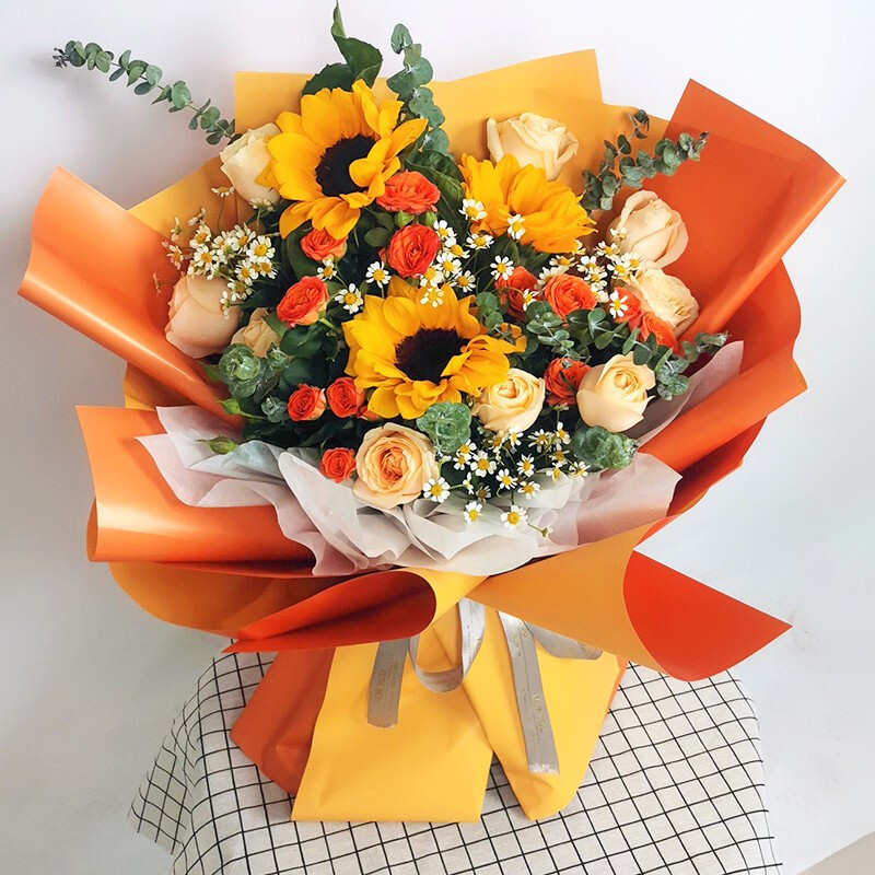 花 材:精选3支向日葵,9朵香槟色玫瑰,5支多头橙色小玫瑰(断货则用同数量洋桔梗替代),搭配小雏菊,尤加利叶装饰。