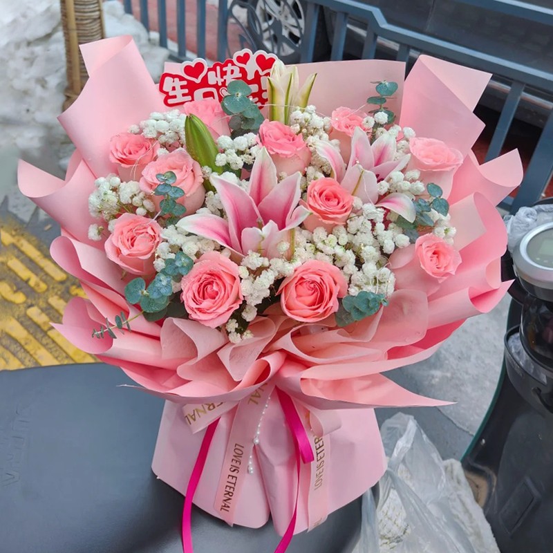 花 材:11枝戴安娜粉玫瑰,2枝多头粉百合,白色满天星,尤加利叶间插点缀。