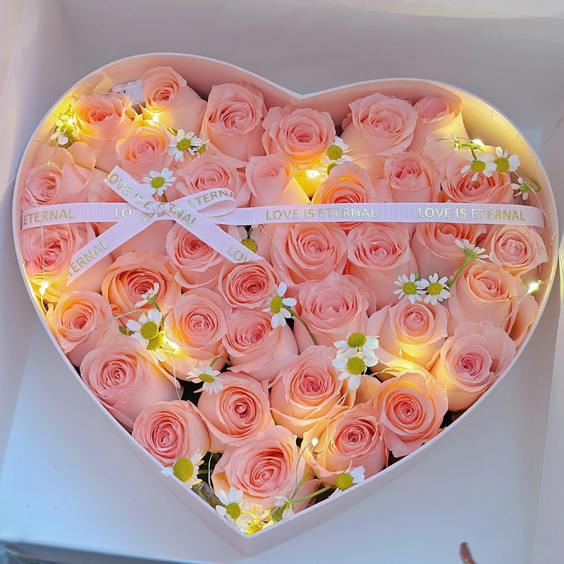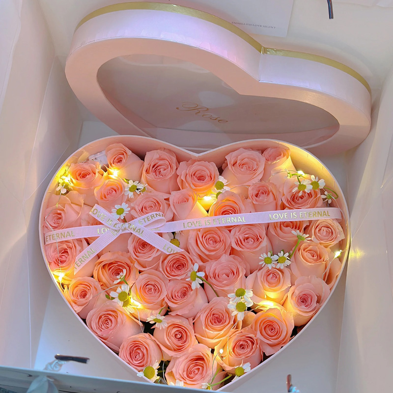 包装: 心形礼盒装(礼盒尽量选择浅色系的透明盒盖,若断货则根据当地存货随机选择心形礼盒)。