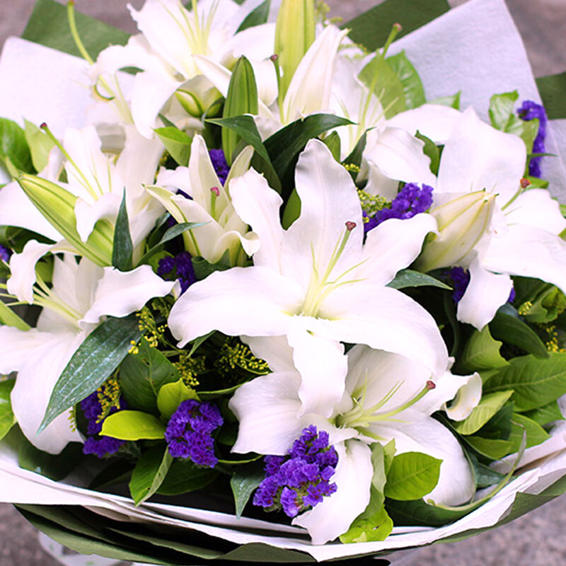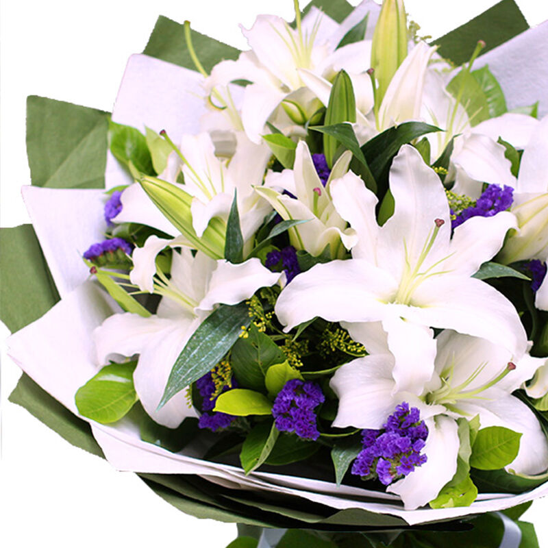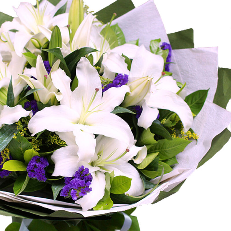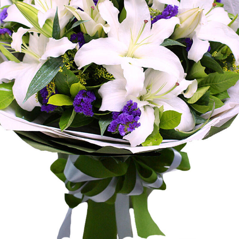 花 材:精心挑选33朵香水百合。栀子叶,勿忘我,黄莺点缀。