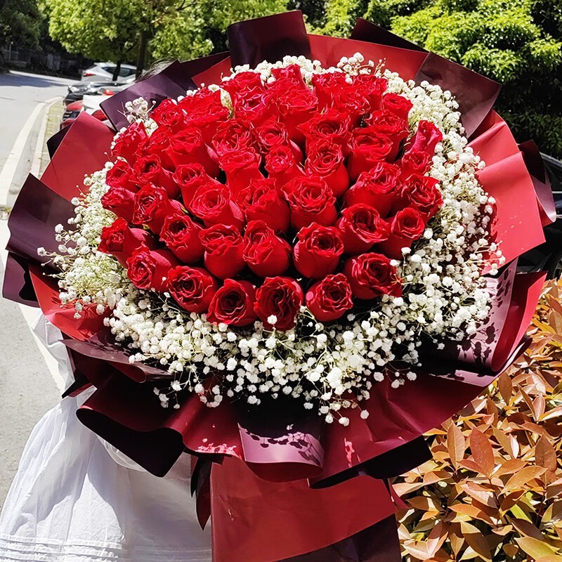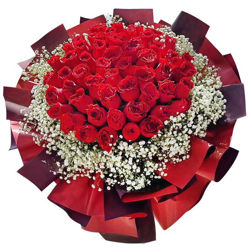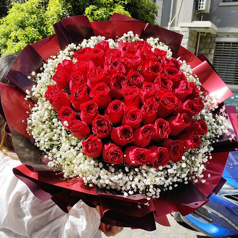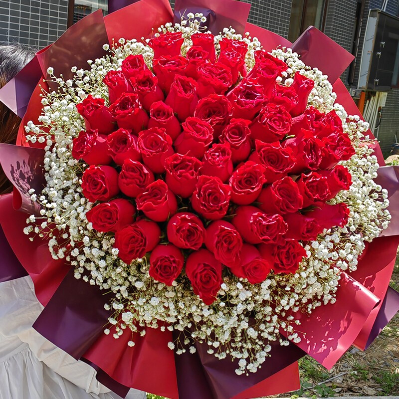 花材: 精选52朵顶级红玫瑰,满天星环绕装饰。