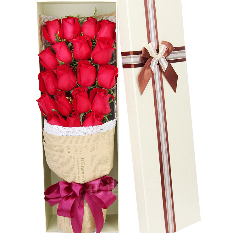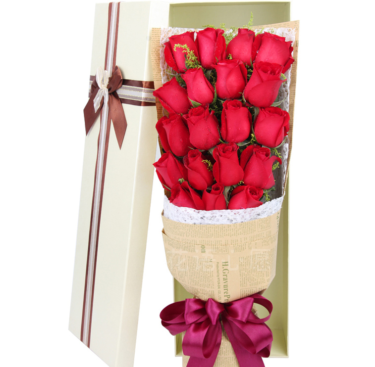 花材: 19朵顶级红玫瑰、黄莺搭配。
