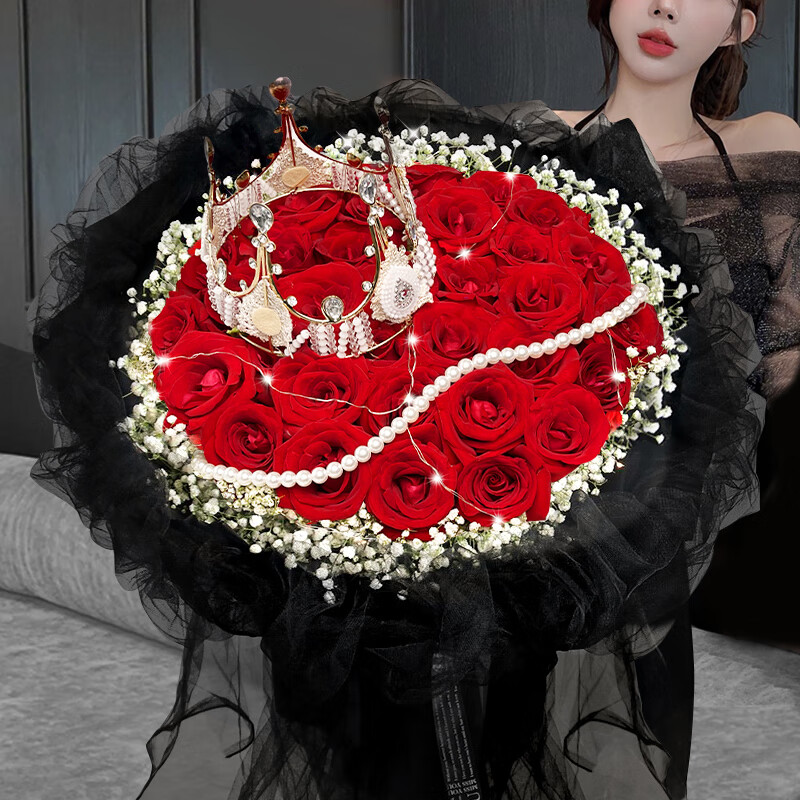 花材: 33支精品红玫瑰,1条珠串,1顶皇冠(款式随机),1条灯带,搭配满天星环绕装饰。