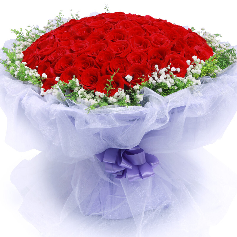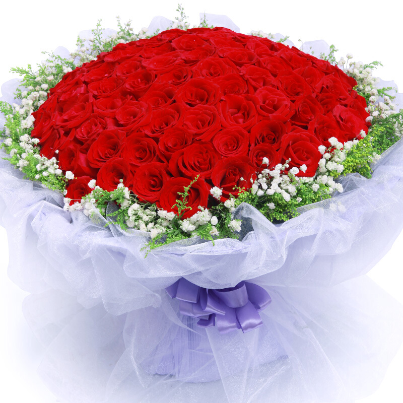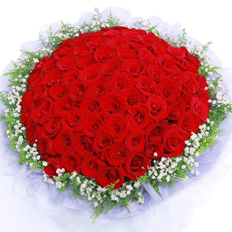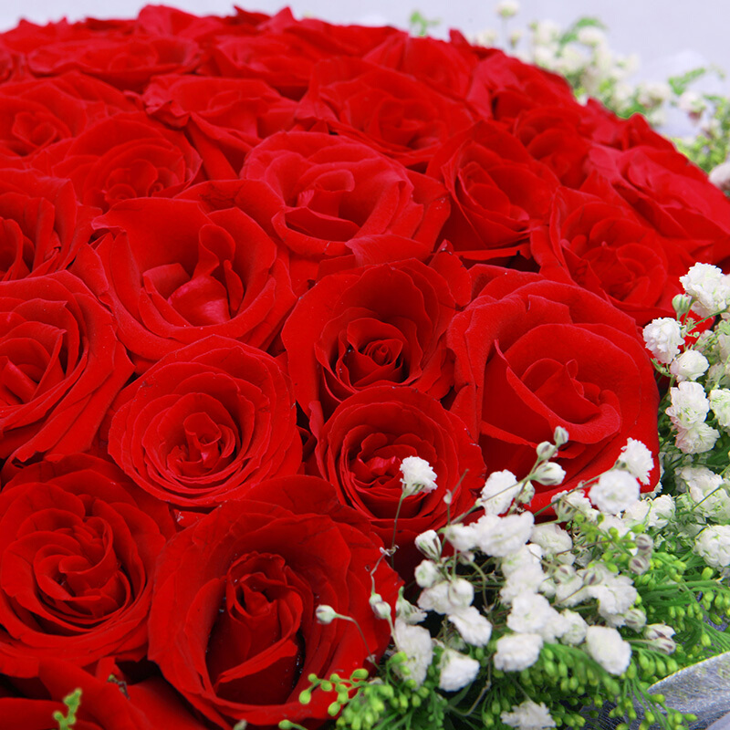 花 材:精选顶级99朵红玫瑰,黄莺、满天星围绕。