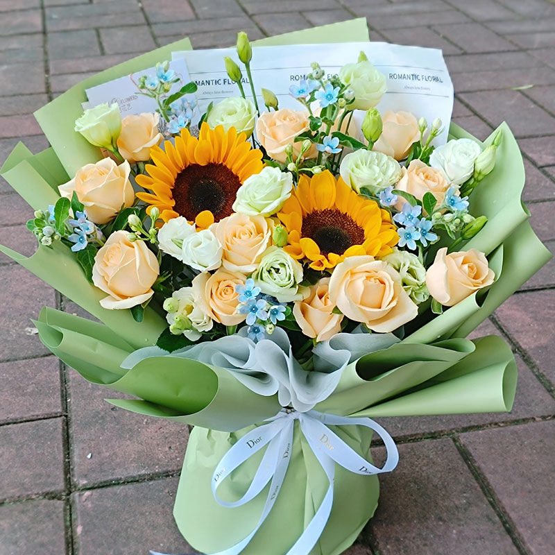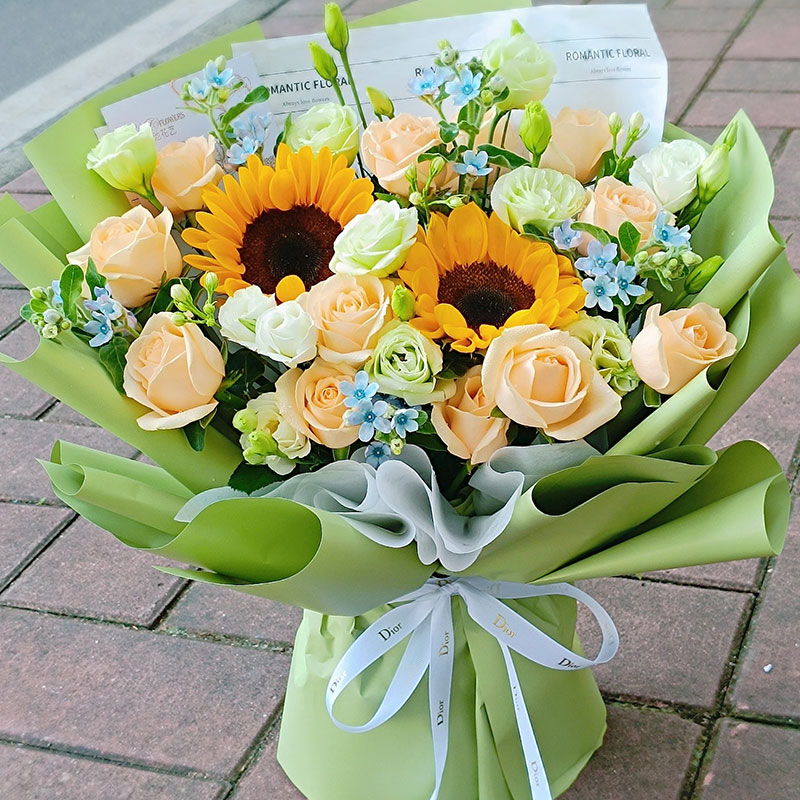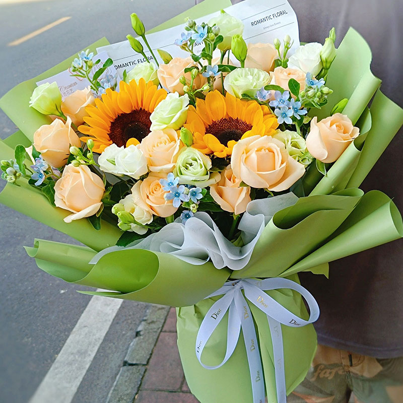 花 材:2朵向日葵,11朵香槟玫瑰,5支洋桔梗,搭配蓝星花装饰。(蓝星花为季节性花材,非应季则替换为其他配花来保证花束效果)