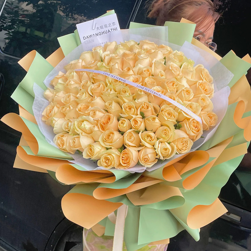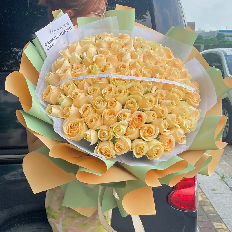 花 材:99朵香槟玫瑰,搭配缎带装饰花面。