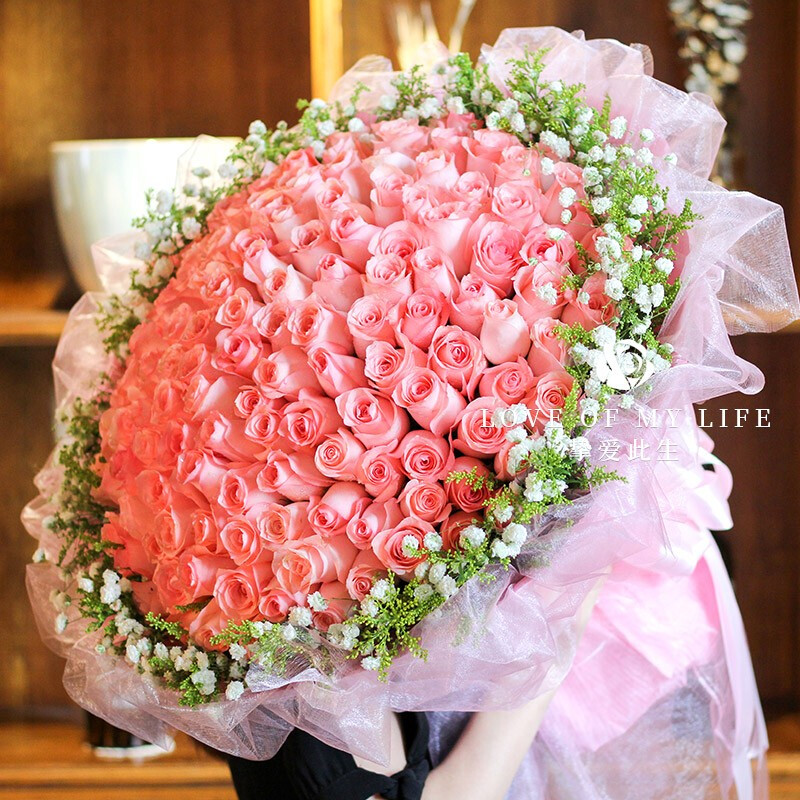 花材: 99朵精品粉玫瑰,搭配黄莺草、满天星外围环绕。