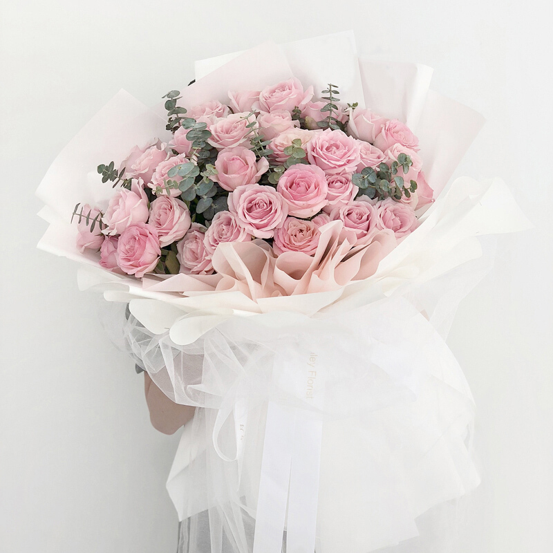 花材: 33朵精品粉玫瑰,搭配尤加利叶点缀。