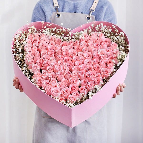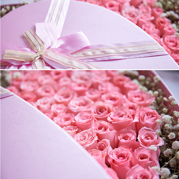 花 材: 99支戴安娜玫瑰,白色满天星丰满围边