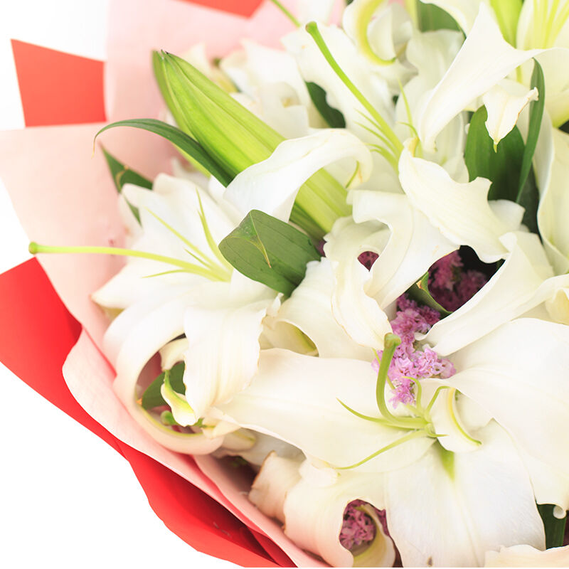 花 材:24朵白百合,紫色小花、黄莺草点缀。