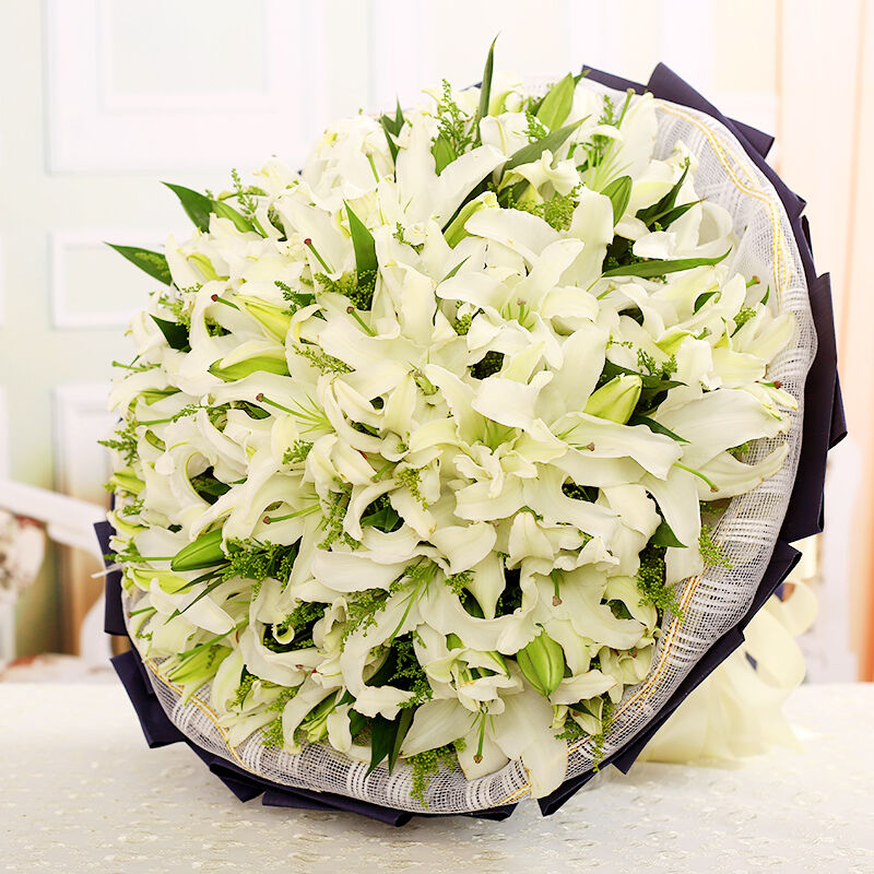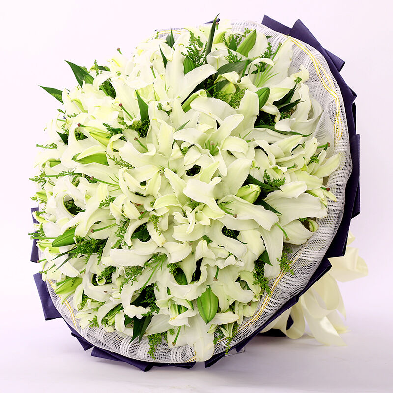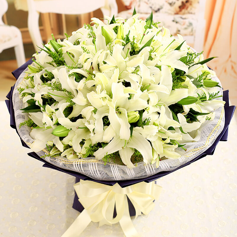 花材: 18支多头白色香水百合(约52朵),黄莺点缀。