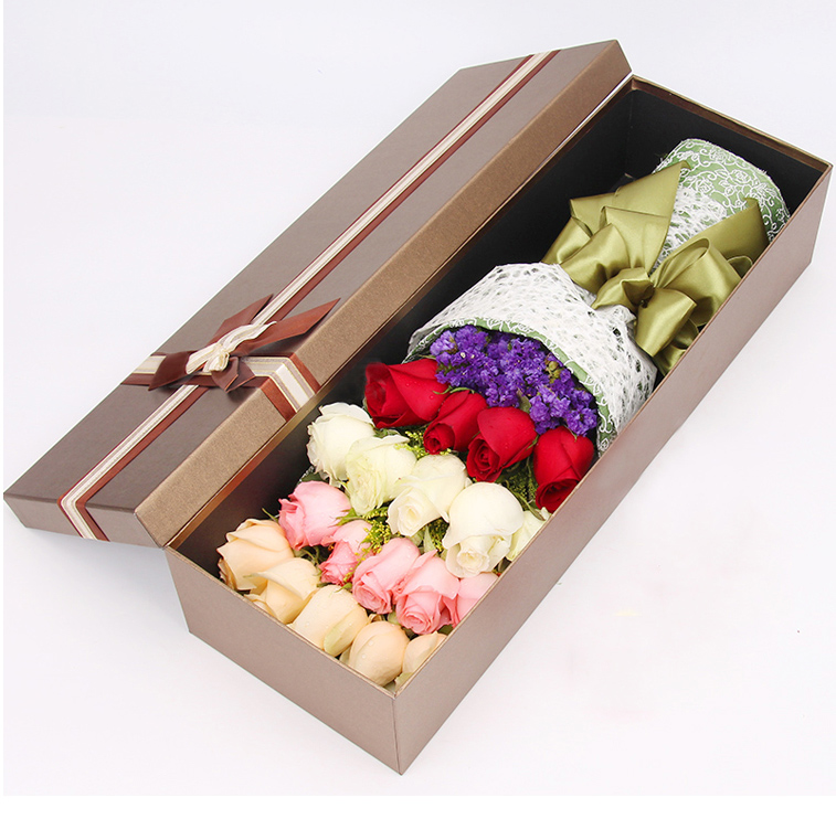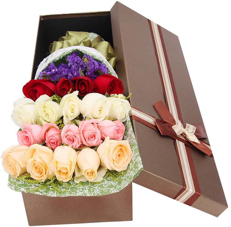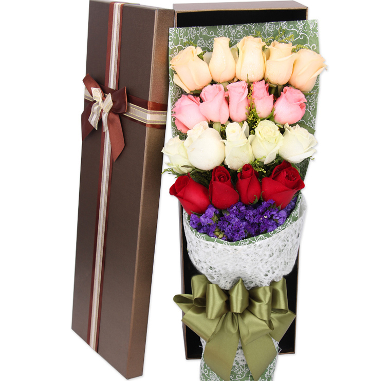 花 材:精选19朵玫瑰(5朵香槟玫瑰、5朵粉玫瑰、5朵白玫瑰、4朵红玫瑰),黄莺、勿忘我点缀。