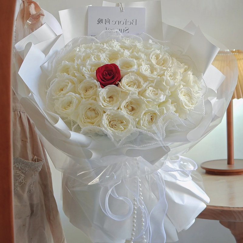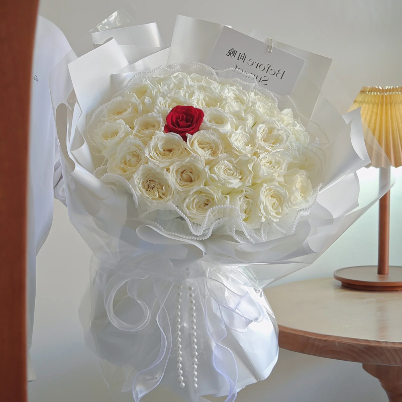 花材: 98朵白玫瑰,1朵红玫瑰,红玫瑰居中。