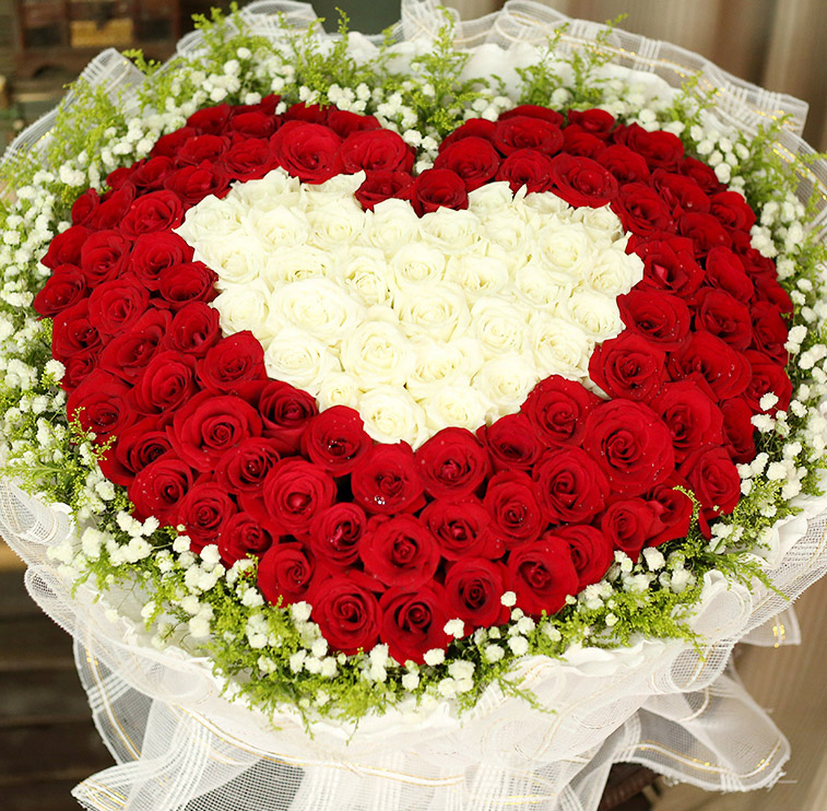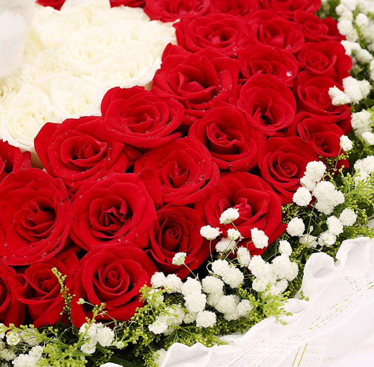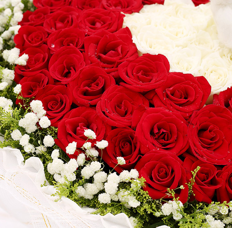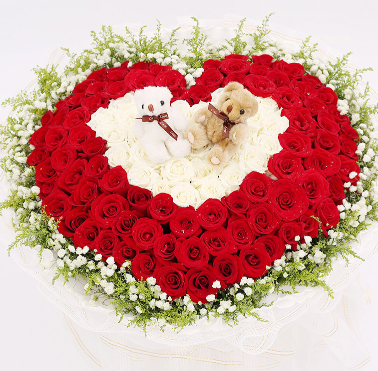 花材: 99朵混色玫瑰(红+白),一对小熊,搭配黄莺、满天星。