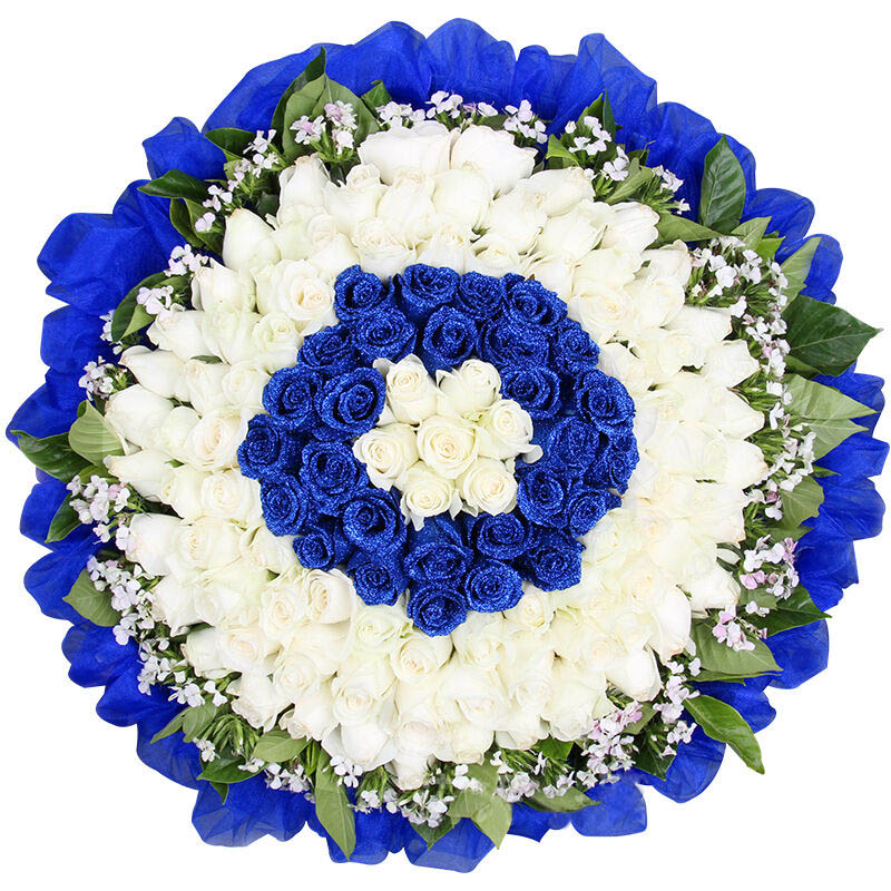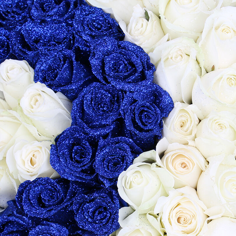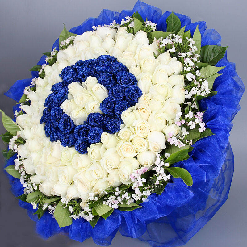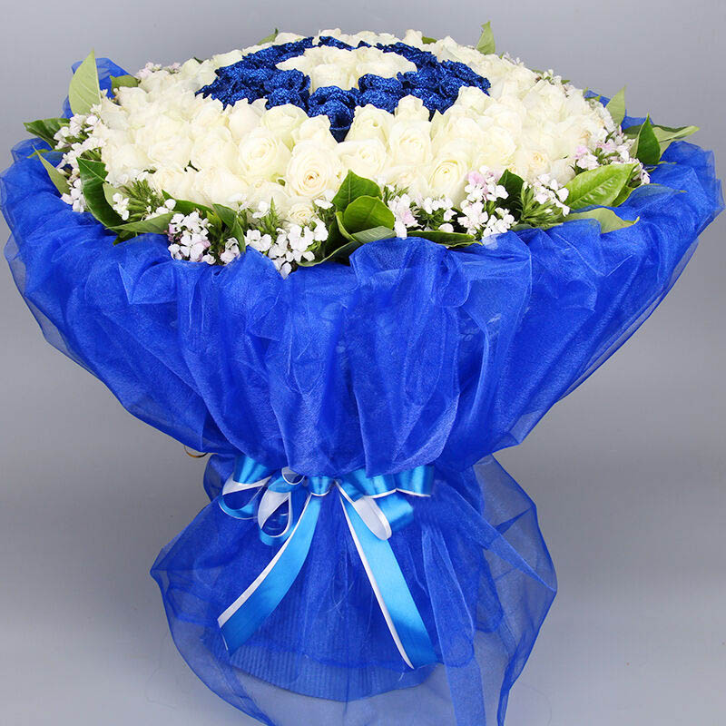 花材: 精选99朵顶级玫瑰(30朵蓝玫瑰,69朵白玫瑰),栀子叶,相思梅围绕。