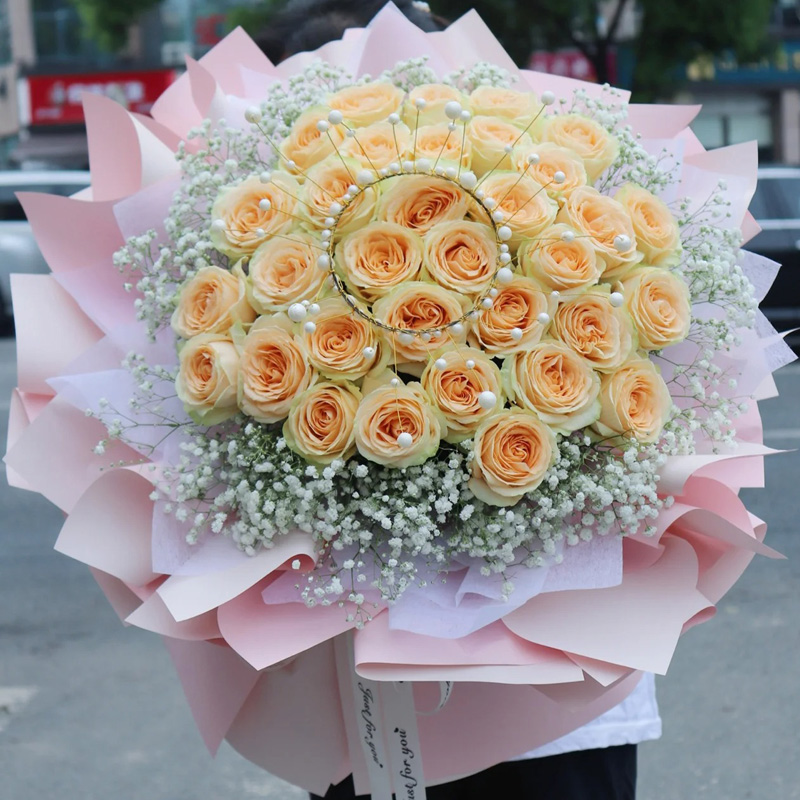 花 材:33朵香槟玫瑰,1个皇冠,搭配满天星环绕。