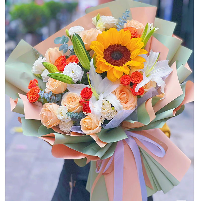 花 材:9朵香槟玫瑰,1朵向日葵,2支多头白色香水百合,5支橙色泡泡,5支洋桔梗,搭配尤加利叶装饰。
